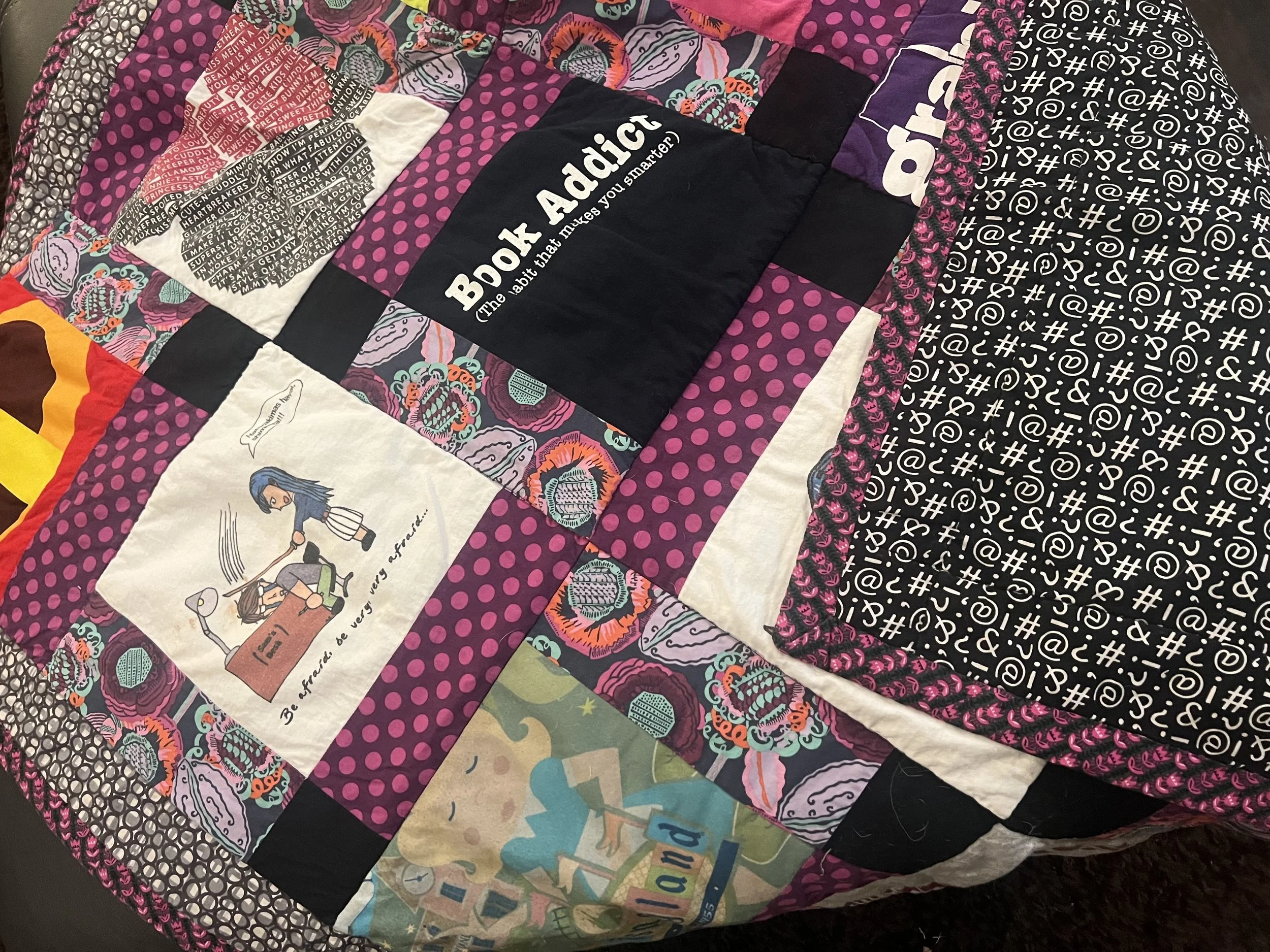 Stitch Happens Creative specializes in custom memory quilts made from meaningful clothing. Whether it’s a collection of concert t-shirts, baby clothes, sports jerseys, or clothing from a loved one, I transform those items into a beautiful quilt that preserves your memories for years to come.